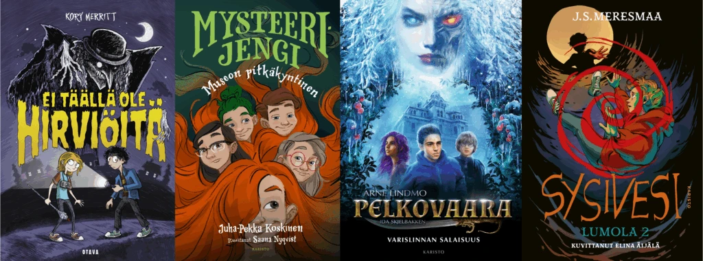 Juha-Pekka Koskisen kirjoittama ja Saana Nyqvistin kuvittama Mysteerijengi (ikäsuositus 9+) on huimaavan jännittävä sarja, jossa tutkitaan yliluonnollisia olentoja ja outoja tapauksia. Uusimmassa osassa Museon pitkäkyntinen Nico, Mimosa, Elina ja Iivo viettävät yön museossa selvittääkseen, kuka siirtelee vanhaa parantajan sauvaa muinaisen noitaesineistön näyttelyssä. Museo on öisin aavemainen paikka, ja pitkäkyntinen osoittautuu odotettua ovelammaksi.